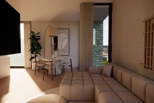 Woonkamer geeft toegang tot een ruim balkon met uitzicht op de 'Groene Loper'.