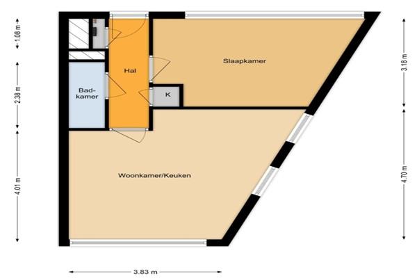 Vanuit de hal komt u in de slaapkamer, woonkamer/ keuken en de badkamer met inloopdouche en wastafel. De aansluiting voor de wasmachine en droger zijn in de badkamer te vinden.