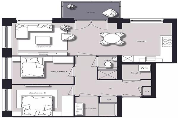 De badkamer is netjes afgewerkt en voorzien van een douchehoek, dubbele wastafel en een elektrische handdoekradiator. Het appartement heeft daarnaast een apart toilet en een berging met aansluitingen voor wasmachine en droger.