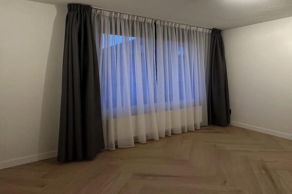 Aan de voorzijde van het gebouw bevindt zich de ruime woonkamer in L-vorm, voorzien van een nieuwe visgraatvloer en veel natuurlijk licht door de brede raampartijen.