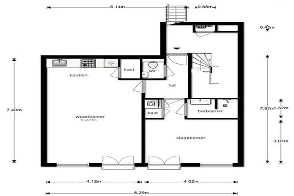 Entree, verzorgd gemeenschappelijk trappenhuis met de woningtoegangsdeur op de tweede verdieping. Hal met toegang tot de woonkamer en het separate toilet met fontein. Ruime woonkamer met open keuken welke is voorzien van diverse inbouwapparatuur zoals een koelkast met vriesvak, 4-pits gaskookplaat, afzuigkap, combi oven/magnetron en vaatwasser. De slaapkamer is eveneens te bereiken vanuit de woonkamer en beschikt over een en-suite badkamer met inloopdouche en een wastafel met meubel. De slaapkamer beschikt verder over een ruime inbouwkast met de CV ketel, de wasmachine en droger.
