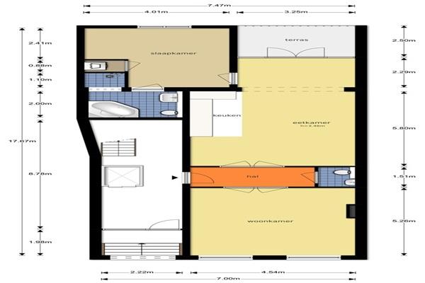 Binnenkomst via het nette gemeenschappelijk trappenhuis op de bel-etage. Zeer ruime en lichte woonkamer met open keuken. Het woongedeelte loopt vanaf de voorzijde tot achterzijde. Voor bevindt zich de ruime zitkamer en achter een open keuken met eetkamer. Tevens toegang tot ruim balkon achterzijde. Woonkamer opgedeeld in een ruime zit- en eethoek. Keuken voorzien van alle benodigde (inbouw) apparatuur. Ruime slaapkamer eveneens aan de achterzijde gelegen. Badkamer voorzien van bad, douche en wastafel. Separaat toilet. Separate ruimte voor wasmachine/droger.