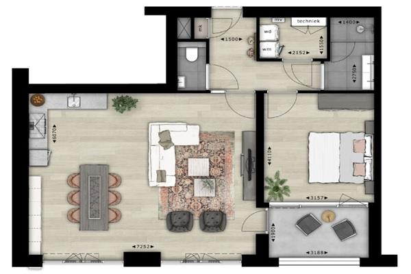 Het appartement beschikt over een ruime woonkamer met open keuken, één royale slaapkamer, een luxe badkamer met sanitair van Villeroy & Boch, separaat toilet, extra berging en een fijne loggia/balkon met prachtig uitzicht. De woning is volledig afgewerkt met een luxe PVC-vloer in houtlook en geschilderde wanden, waardoor je alleen je meubels nog hoeft te verhuizen.