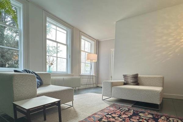 Via de rode trap kom je op de eerste etage waar zowel de badkamer als de woonkamer zijn gesitueerd. Door de 3 grote ramen, de hoge plafonds en de kleur keuze voelt deze etage erg ruim maar toch ook knus aan. De badkamer is voorzien van toilet, douche en wastafelmeubel.